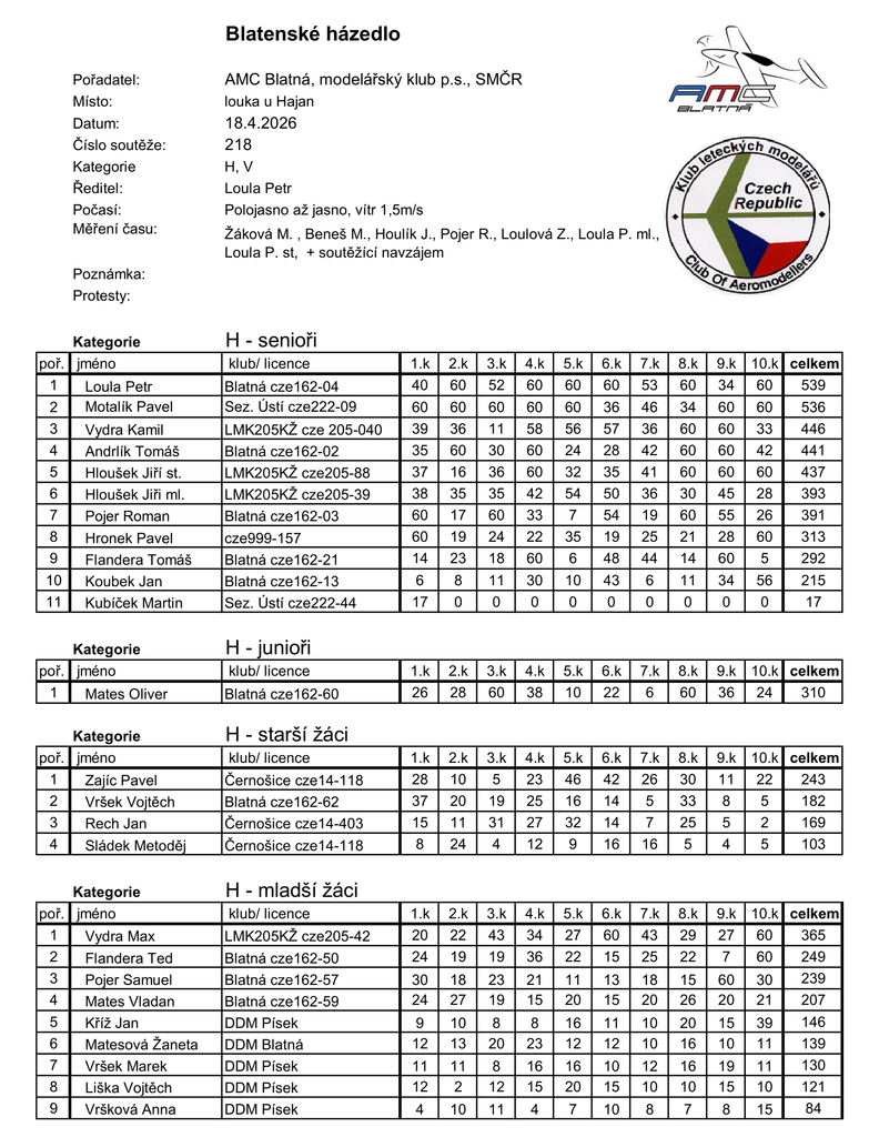Pro práci s mládeží ani nevím jak všichni létali. Podle výsledků je vidět, že si řada soutěžících ne vždy poradila se záludností jarního počasí. V jeden okamžik byla silná termika a naletět maximum nebyl problém. A okamžik na to byl problém naletět slušný čas. Někomu se dařilo lépe, někdo se trápil, ale věřím, že si většina soutěžících sobotní dopoledne užila. Krásné počasí a pohyb na louce, co více si přát? Nezbývá než opět poděkovat všem přítomným za účast, kolegům z klubu a dobrovolným časoměřičům za pomoc s organizací soutěže. Děkuji i všem, kteří zajistili občerstvení a nebo napekli dobroty pro všechny přítomné.