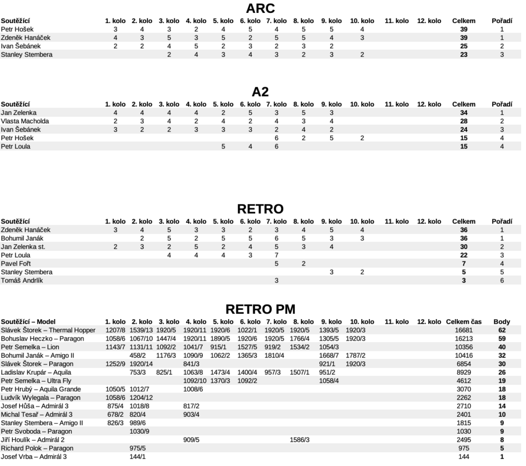 Celkově lze říjnové kolo hodnotit jako klidné, komornější, ale s několika velmi pěknými výkony. Podzimní termika ukázala, že i v závěru sezóny se dá létat s elegancí a lehkostí, kterou známe z letních dnů. Všem, kdo se zapojili, děkuji za zaslané výsledky i komentáře – a těším se na listopadové kolo 🙂